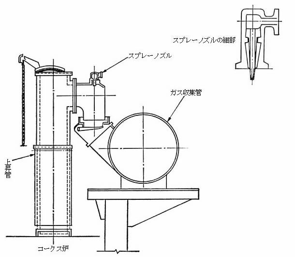 (三) 第一号の「コークス炉発散物が流入しない構造」とは、運転室の内部に清浄な空気を送ること によりその内部を陽圧にする等の措置を講じたもの又は装炭車、押出機、ガイド車若しくは消火車 の操作が隔離室において遠隔操作により行われ、コークス炉発散物が運転室の内部に流入するおそ れのないものをいうこと。 (四) 第四号の「上昇管部に必要な設備」とは、上昇管部にスプレーノズルを付設し、コークス炉へ 石炭等を送入する時にこれをガス収集管方向へスプレーさせることによりコークス炉内部のガスを ガス収集管へ吸引するための設備をいい、図示すれば、次のような例があること。