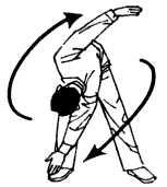 両足を広く開き、両手を斜前下の方に出し、そこから体を前左後方に大きく回し、続いて反対の右の方にも回す。 | ![]() |