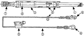 [1]ベルト[2]補助ベルト[3]ランヤードのロープ等[4]フック[5]伸縮調節器[6]環[7]バックル ウ ハーネス型安全帯の例