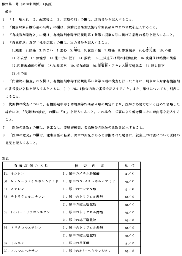 有機溶剤中毒予防規則 様式第3号(裏面)