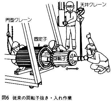 - ② 回転子の抜き・入れ作業(図6)では、軸に差し込む継ぎ足し用パイプの外れによる回転子の落下等の危険性があった。