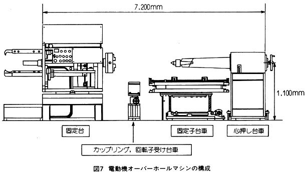 「電動機オーバーホールマシン」とよぶ装置を開発した。この装置は電動機の分解と組み立ての作業、すなわちカップリング、ベアリングおよび回転子の脱着を、全工程2人操作による1台の装置で、しかも極めて安全に作業できるように機械化したものである。その構造は、図7に示すように、次の4部分で構成されている。