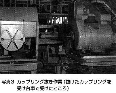 - ④ 固定子台車を走行させ、回転子を抜き出す(写真4)。