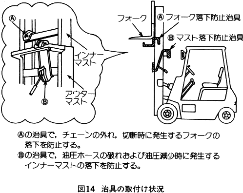 まず、固定されているアウターマストに着目し、引っ掛け治具でインナーマストの落下と、フォークの落下を防止する方法を考案した。その結果、写真9のフォーク落下防止治具(重量2.1kg)と写真10のマスト落下防止治具(重量4.2kg)を製作した。