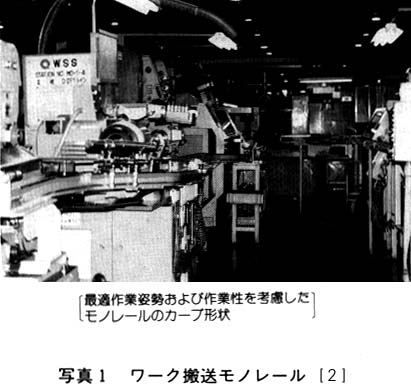 シャフト加工ラインの見直しを行い、図2のように「ワーク自動供給装置」「ワーク搬送モノレール型コンベヤー」「ワーク反転装置」「ワーク自動脱着装置」を取り付け、加工ラインの改善を図った。(図3、写真1、図4、5、6)