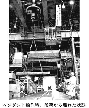 クレーンは、床上操作式天井クレーンに改造し使用してきた。ところが、このペンダントスイッチは、上部をフリーバランサーで固定しているだけなので、長尺物や、変形物の玉掛け運搬作業では、十分な退避距離が取れず、無理な作業姿勢を強いられたり、場合によっては、身体の一部がワークの下に入ったまま作業を行わなければならない等安全衛生上の問題が指摘されていた。そこで、無理のない正しい姿勢で安全な作業が行えるように改善することになった。