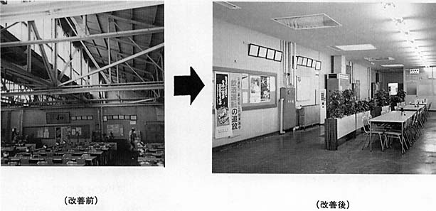 食堂の天井は鉄骨が露出し、また天井が高いため冷暖房効果が下がる等食堂としての環境が悪いため、食堂らしい清潔な明るい環境に改善するため、天井の新設、照明器具を増設、壁を明るく暖かいカラーに塗り替えた。