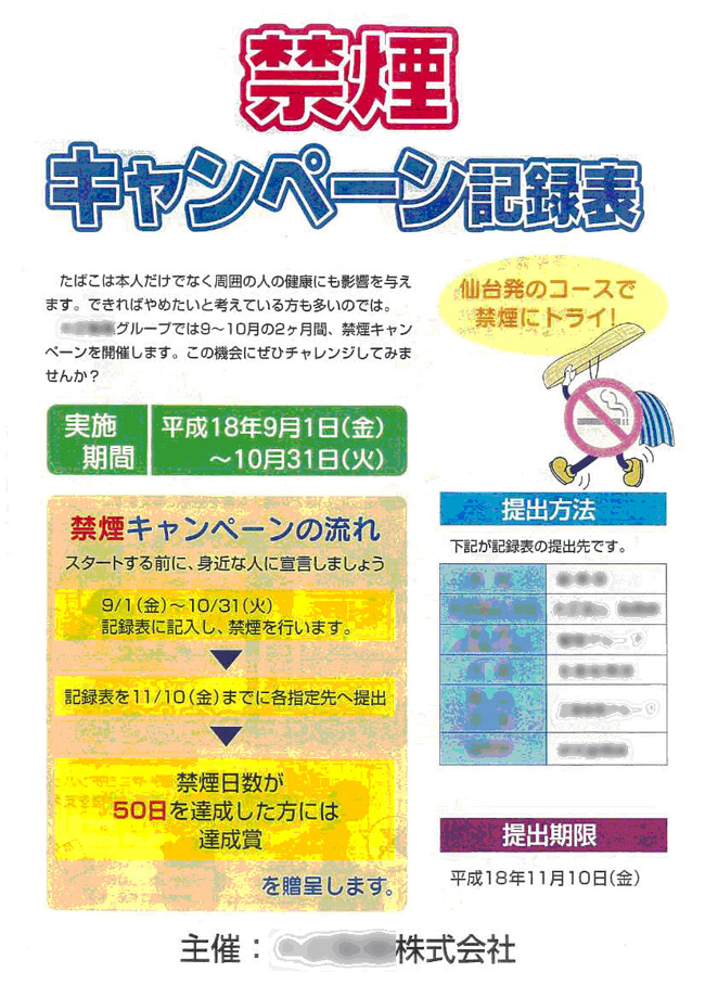 | 平成18年9月1日から10月31日の禁煙キャンペーンでは、参加者に禁煙キャンペーン記録表を配布した。スタートする前に身近な人に禁煙宣言を行い、宣言をした相手にサインしてもらい、スタートとなる。記録表を11月10日までに各指定先へ提出し禁煙日数が50日を達成した人には禁煙達成賞として、電動歯ブラシを贈呈する(図6−1〜4)。 |