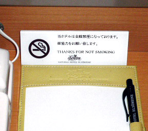 | ホームページで「全館禁煙都市型ホテル」と禁煙宣言をし、ホテルの入口、室内、ルームキー等に禁煙の表示をした(写真21−3〜8)。 |