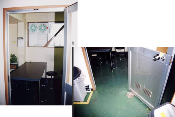 喫煙室の窓に換気扇を2基設置し、たばこの煙を屋外に排出するようにした。 喫煙室を利用するときは、扉(上部はガラス)を閉じて喫煙する。 扉に付いたガラリなどの開口部から空気の取り入口れが確保されているので、換気扇に向かって空気が緩やかに流れ、喫煙室から非喫煙場所にたばこの煙は漏れない。